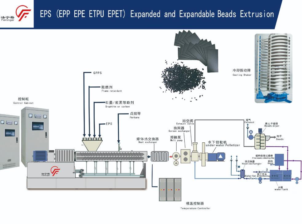 法宁格新研发的石墨EPS挤出生产线采用科学挤出机的设计。具有丰富的生产经验和平行双螺杆设计的先进理念,通过均匀温度的换热器,出料孔不被堵塞,使成品具有优质的质量。