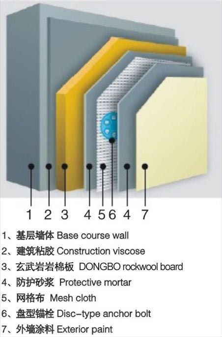 岩棉板外保温抹面系统主要由粘结层、岩棉板保温层、抹贴面层、锚固件、饰面层及配件等构成,基本构造见下图。