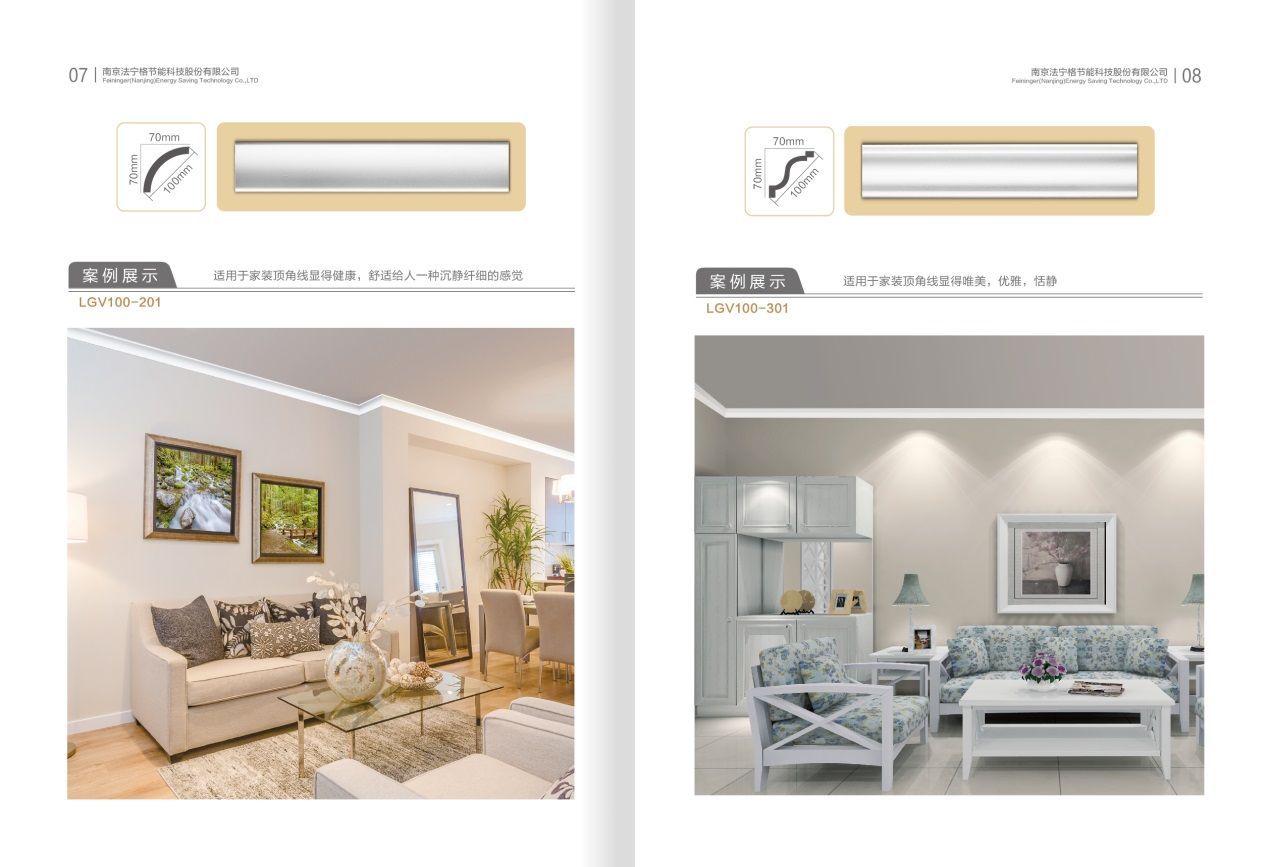法宁格千工欧式装饰材料,采用XPS发泡制得,是目前国际市场新型的一种绿色环保装饰材料。包括角线、平线系列,花角平线系列,饰花系列以及灯盘、浮雕系列等。法宁格千工装饰材料克服了传统GRC、石膏、大理石、木材、PVC木塑等传统装饰材料款式、花色形状单一、安装复杂、时间久会出现裂缝等缺点,具有表面光泽度高、光滑细腻、材质轻、防水、防蛀、防霉、不变形、不开裂、不脱落等诸多优点,而且结构形式多样、线条流畅美观、安装简单便捷、绿色环保、材料可重复回收利用,广泛应用于家庭及各类公共建筑的檐口、腰线、角线、墙饰板等室内外建筑装饰装修行业。