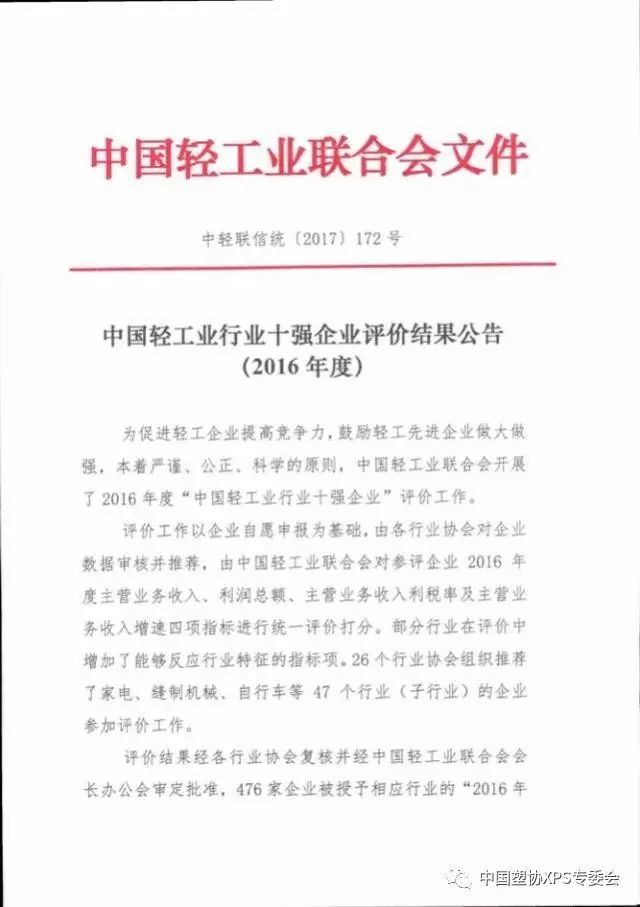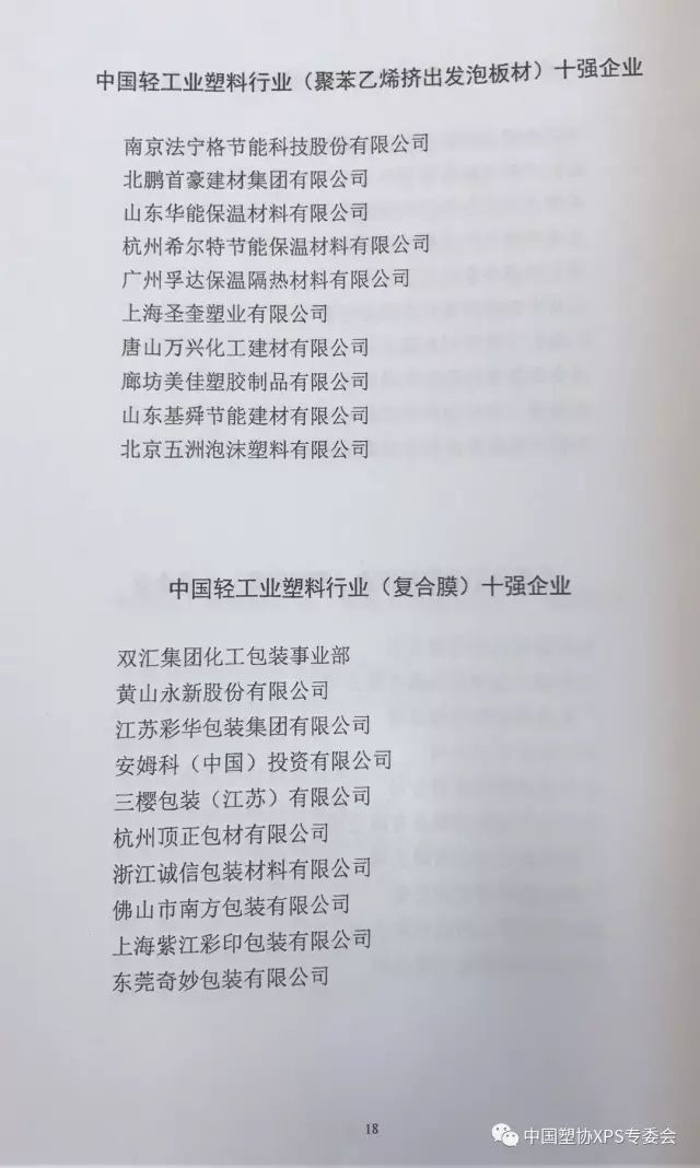 热烈祝贺法宁格获得“中国轻工业塑料行业(聚苯乙烯挤出发泡板材)十强企业”荣誉称号