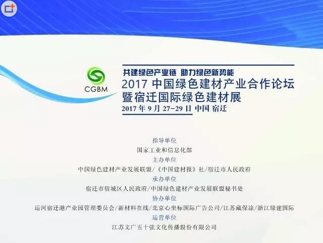 2017中国绿色建材产业合作论坛暨宿迁国际绿色建材展即将于9月27-29日在宿城区拉开帷幕。本届论坛暨展会期间还将举办宿迁经贸洽谈会系列展览论坛、中国绿色建材消费宣传周、中国绿色建材新产品发布会等系列活动。