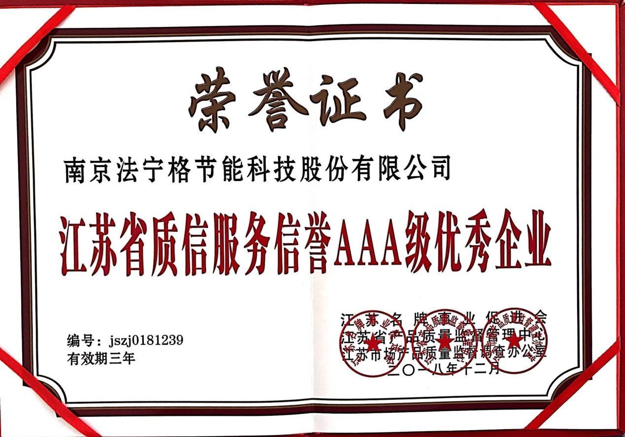 近日,江苏名牌事业促进会、江苏省产品质量监督管理中心和江苏市场产品质量监督调查办公室联合授予南京法宁格节能科技股份有限公司“江苏省质信服务信誉AAA级优秀企业”荣誉称号!