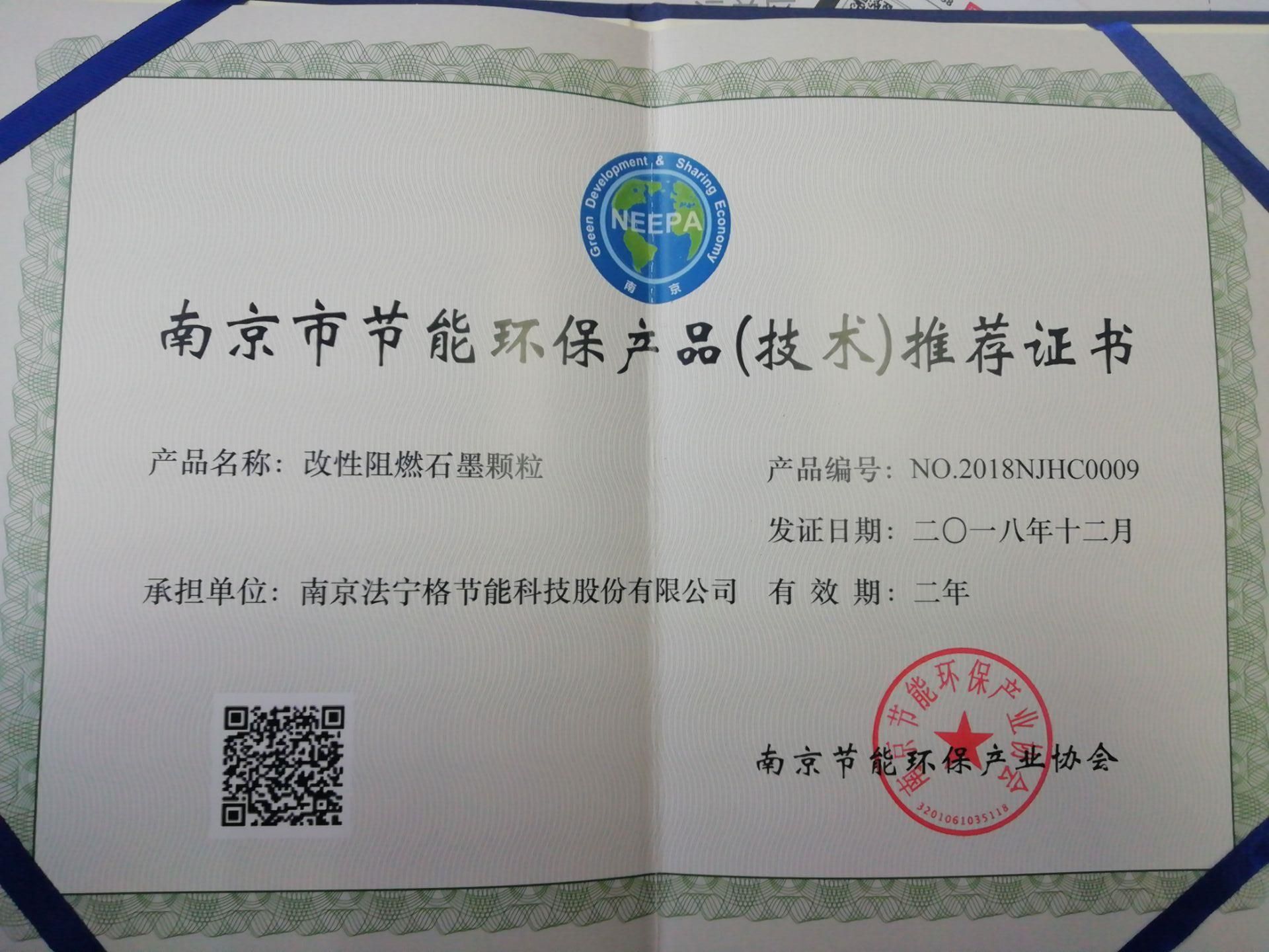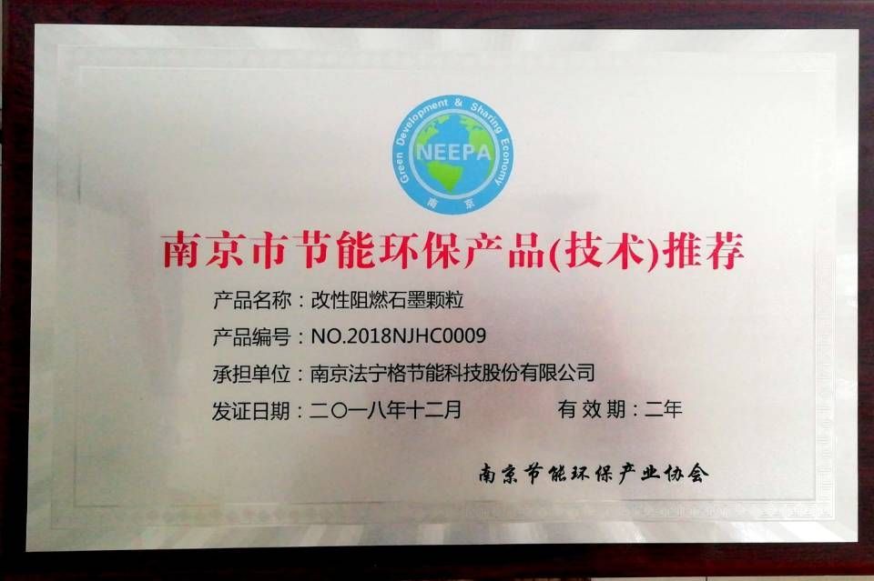 法宁格改性阻燃石墨颗粒荣获南京市节能环保产品(技术)推荐证书